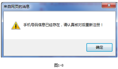 3、相同的手機號只能注冊一次,如重復使用已注冊的手機號,會提示錯誤,如圖1-8所示: