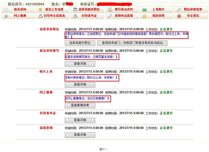 2、打印準考證的時間在‘報名工作流程’下的‘打印準考證’位置查看,如圖7-1