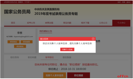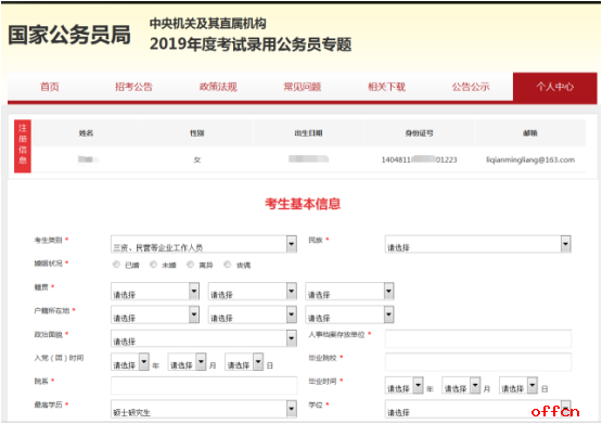 中公教育專家提醒考生,點擊“完善個人信息”之后就要進入全面填寫信息頁面,考生們此時可將相關的證件準備出來,以便填寫時準確輸入,頁面詳情如下: