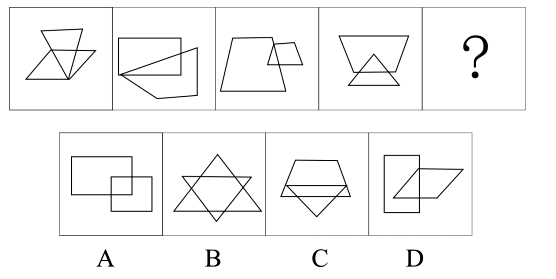 (答案:D。題干中前四個圖呈現出的規律是:公共部分是三角形。依據這一規律,正確答案應為D。)