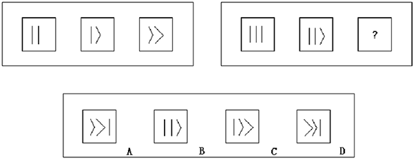 例題:下題給出兩套圖形,左套中的三個(gè)圖形在構(gòu)成或變化上,具有某種特點(diǎn)或遵循某種規(guī)則。要求從下面四個(gè)選項(xiàng)中,選擇一個(gè)取代右套中的“?”,使右套圖形也具有與左套圖形相同或相似的構(gòu)成特點(diǎn)或變化規(guī)則。