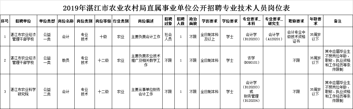 招聘單位、崗位、名額、條件、專業要求等詳見《2019年湛江市農業農村局直屬事業單位公開招聘專業技術人員崗位表》(附件1)