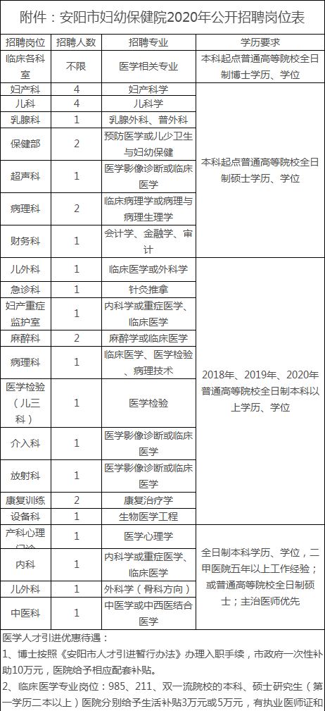 普通高等院校全日制本科以上學歷畢業生和專業技術人員。招聘崗位、條件及人數見《安陽市婦幼保健院2020年公開招聘崗位表》(詳見附件)