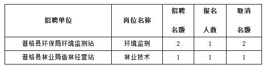 按照《中共普格縣委組織部普格縣人力資源和社會局關于2015年公開招聘事業單位工作人員的公告》規定,根據報名情況,經研究決定取消報名人數未達到1:3開考比例的2個招考崗位(招聘名額3名),現公告如下: