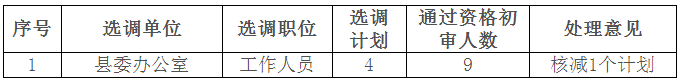 根據《2015年肥東縣直機關面向全縣公開選調公務員(工作人員)公告》,筆試最低開考比例為3:1,因部分職位報考人數不足,經研究決定,核減以下職位的招考計劃。