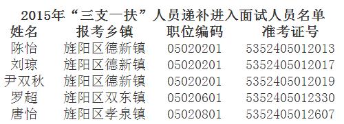 根據(jù)四川省委組織部、四川省人力資源和社會廳等九部門《關(guān)于印發(fā)<2015年四川省高校畢業(yè)生“三支一扶”計劃實施方案>的通知》(川人社發(fā)〔2015〕18號)要求,凡有考生參加考試的崗位,按招募計劃數(shù)2倍確定面試人選。旌陽區(qū)“三支一扶”計劃招募中,黃婷、李倩瑋、張譽耀、鄧江、陳育敏、廖洋、吉慶玲、黃智偉等人主動放棄資格復審、面試資格,根據(jù)相關(guān)規(guī)定,出現(xiàn)的面試人員缺額在同一崗位中由到低分進行遞補,附遞補資格復審、面試人員名單。