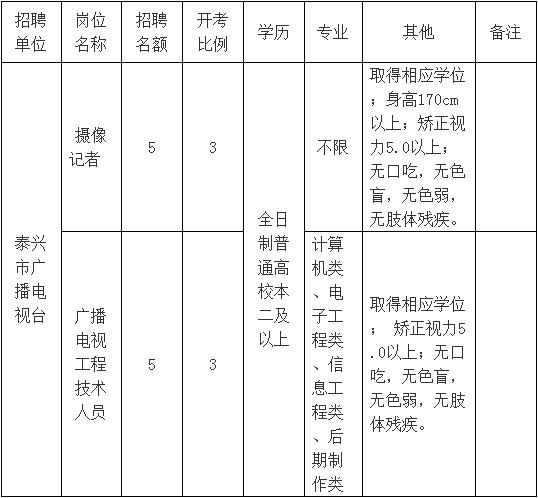 本次擬招聘攝像記者5名、廣播電視工程技術人員5名。具體如下: