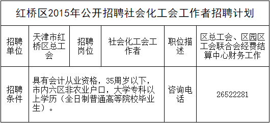 為適應工會工作發展需要,根據市總工會《關于2015年選聘社會化工會工作者的通知》要求,紅橋區總工會擬面向社會公開招聘社會化工會工作者,現將有關事項公告如下: