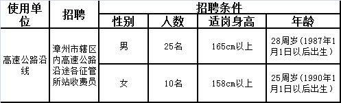 高速公路漳州管理分公司系福建省高速公路有限責任公司下屬的國有企業單位,負責管轄漳州市境內所有已通車運營的高速公路共500多公里。為確保9月份漳州漳永、常東兩個高速公路建設項目通車運營管理,根據有關規定,結合我公司實際情況,現面向社會公開招聘收費人員?,F將有關招聘事項公告如下:
