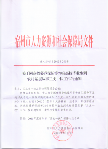 2015安徽蕭縣三支一扶考試招募喬保新等78人通知