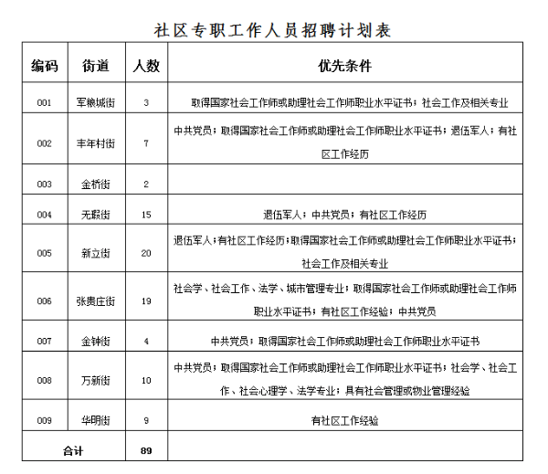 面向社會(huì)招聘社區(qū)專職工作人員89人,具體招聘計(jì)劃見下表: