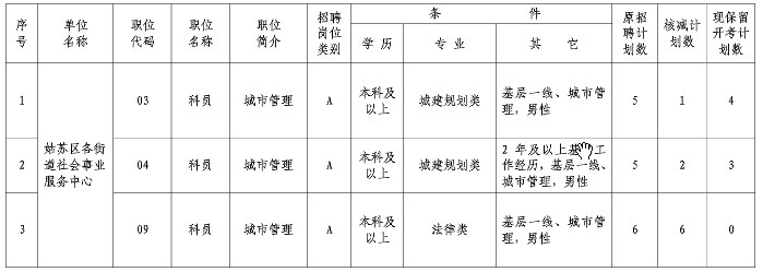 原標題:關于2015年姑蘇區各街道社事中心公開招聘工作人員部分職位達不到開考比例核減招聘計劃數的公告