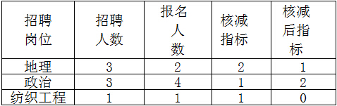 根據(jù)《天臺(tái)縣教育局 天臺(tái)縣人力資源和社會(huì)局 關(guān)于天臺(tái)縣教育局校園招聘2016屆高校畢業(yè)生的公告》規(guī)定,“報(bào)名人數(shù)與錄用崗位須達(dá)到 2∶1及以上的比例方可開考,未達(dá)比例的相應(yīng)核減錄用指標(biāo)或不開考。”經(jīng)研究,決定對(duì)以下錄用崗位指標(biāo)進(jìn)行核減。