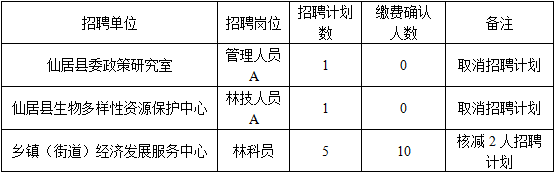 根據《2015年下半年仙居縣事業單位公開招聘工作人員公告》精神,繳費確認人數不足招聘計劃數3倍的崗位,相應核減該崗位招聘計劃人數(其中擬招聘計劃人數為1名的,則取消該崗位招聘計劃)?,F將取消或核減招聘崗位公示如下: