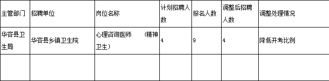 華容縣2015年下半年事業單位公開招聘專業技術人員報名工作已經結束,根據《岳陽市事業單位公開招聘人員實施辦法(試行)》(岳人社發〔2013〕124號)和《華容縣2015年下半年事業單位公開招聘專業技術人員公告》的規定,綜合報名情況,本次招聘共有1個崗位沒有達到規定的開考比例。為了順利開展后續招聘工作,經招聘單位申請,主管部門同意并報市人社局核準,決定對沒有達到開考比例的招聘崗位計劃數作如下調整。其中,調整降低開考比例的崗位1個,具體崗位調整情況: