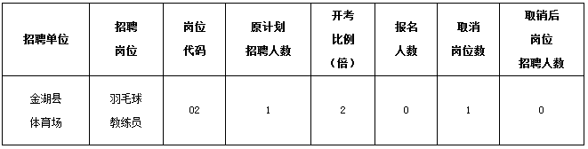 2015年金湖縣體育局公開招聘事業(yè)單位工作人員報名工作已經(jīng)結(jié)束。根據(jù)《2015年金湖縣體育局公開招聘事業(yè)單位工作人員公告》的規(guī)定,對達不到開考比例的招聘崗位予以取消。現(xiàn)將取消崗位公告如下: