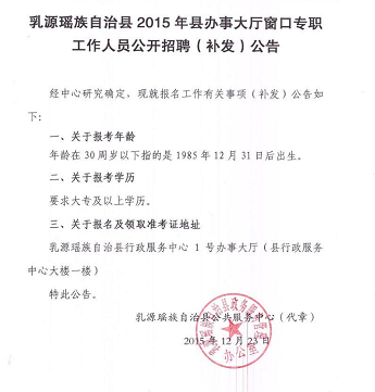 2015廣東乳源縣辦事大廳窗口專(zhuān)職人員招聘補(bǔ)充公告