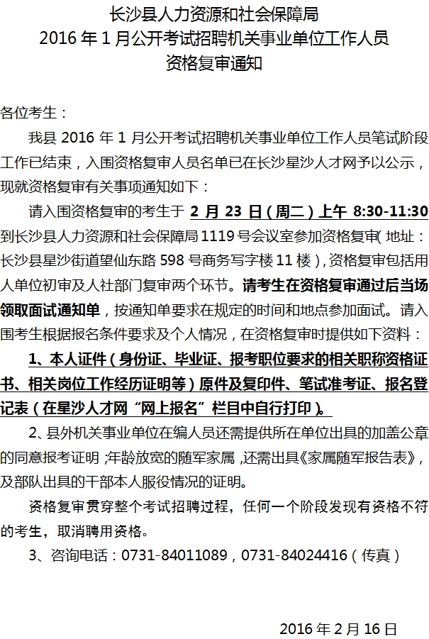 2016年1月湖南長沙市機關事業單位招聘資格復審通知