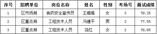 根據(jù)《瑤海區(qū)公開(kāi)招聘工作人員公告》規(guī)定,因聘用人員未能按時(shí)到崗,視為自動(dòng)放棄聘用資格,從該崗位面試人選中按面試成績(jī)從到低分等額有效遞補(bǔ)。現(xiàn)將遞補(bǔ)人員名單公告如下: