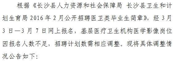 2016年2月湖南長沙市醫衛類畢業生部分招聘崗位計劃數調整公告