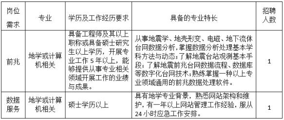 根據中國地震臺網中心業務工作的需要,經局人教司批準,現面向社會公開招聘2名專業技術人員,相關信息如下: