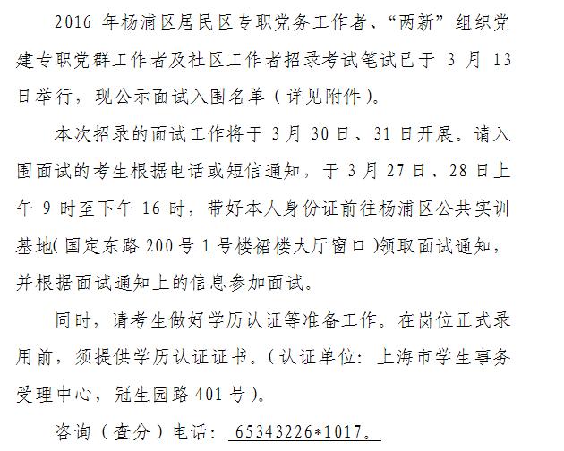 2016上海楊浦區居民區專職黨務、“兩新”組織黨建專職黨群及社區面試公告