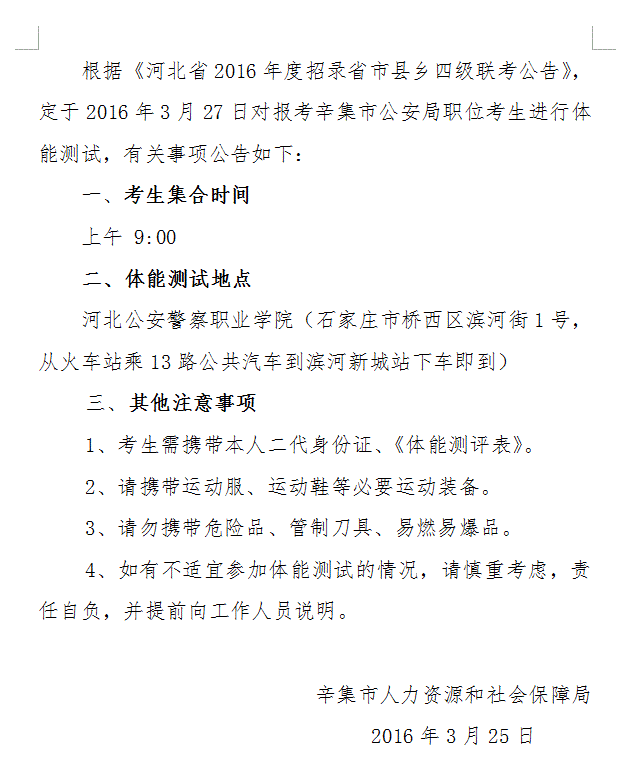 2016河北省市縣鄉四級聯考報考辛集市公安局職位考生體能測評安排