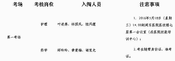 閩東醫院2016年上半年公開招聘工作人員專業技能考核為第一組0032護理,第二組0033藥學,第一組、第二組均在第一考場。專業技能考核為專業技能操作1題,相關專業知識測試2題。