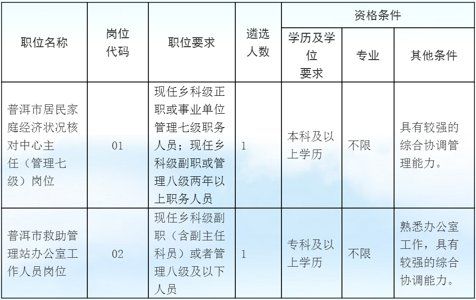 普洱市居民家庭經濟狀況核對中心主任1名(管理七級);普洱市救助管理站辦公室工作人員1名。職位要求具體如下: