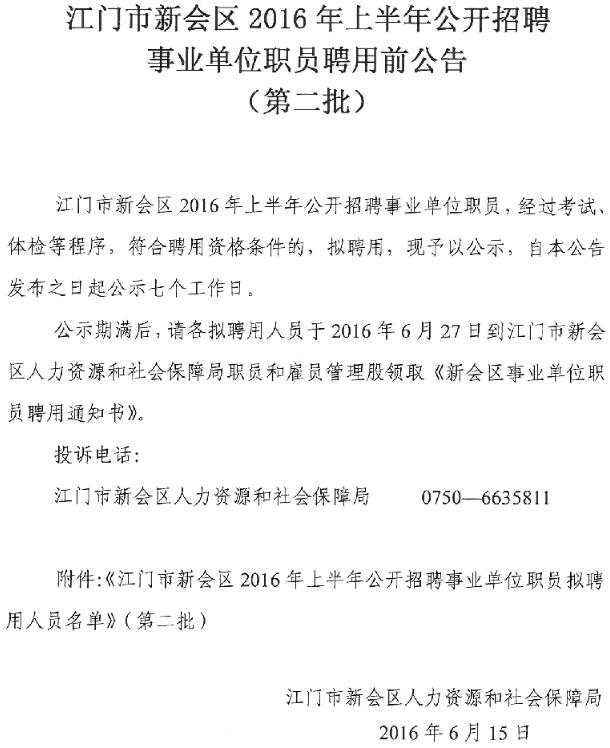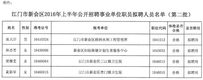 2016上半年廣東江門市新會區招聘事業單位職員聘前公告(第二批)
