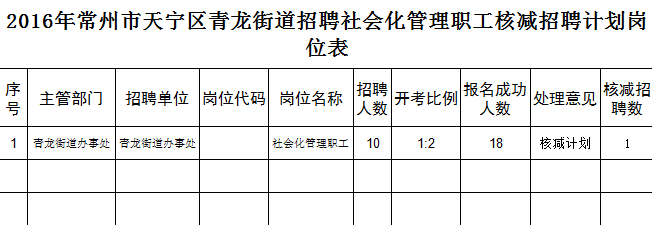原標(biāo)題:2016年常州市天寧區(qū)青龍街道招聘社會化管理職工核減招聘崗位的公告