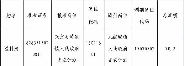 根據《2016年四川省高校畢業生“三支一扶”計劃招募公告》的規定,對有人參加筆試,無人參加面試的崗位,縣人力資源社會部門可在本縣報考同一項目中參加面試且同意調劑的考生中從到低分進行調劑招募。報考我縣九絲城鎮人民政府支農計劃(崗位代碼:15070502)一考生主動放棄面試資格出現缺額,經研究,決定調劑,現就調劑相關事項公告如下: