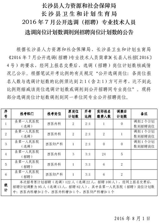 2016年7月湖南長沙縣衛計局選調專業技術人員選調崗位調劑到招聘崗位公告
