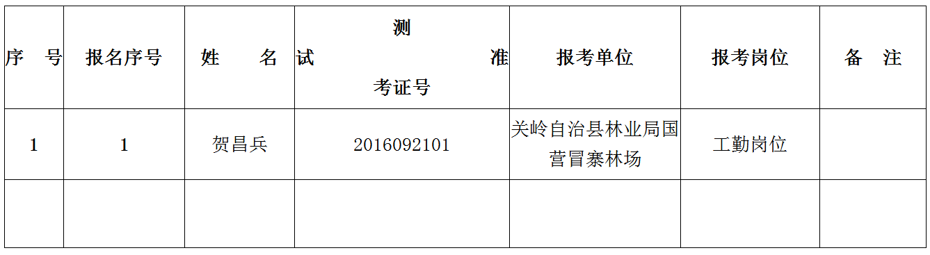 根據《關嶺自治縣林業局2016年公開比選事業單位比選公告》要求,報名及資格審查工作已經結束,資格審查合格1人,進入面試人員1人。現將進入面試人員公示及相關事宜公告如下: