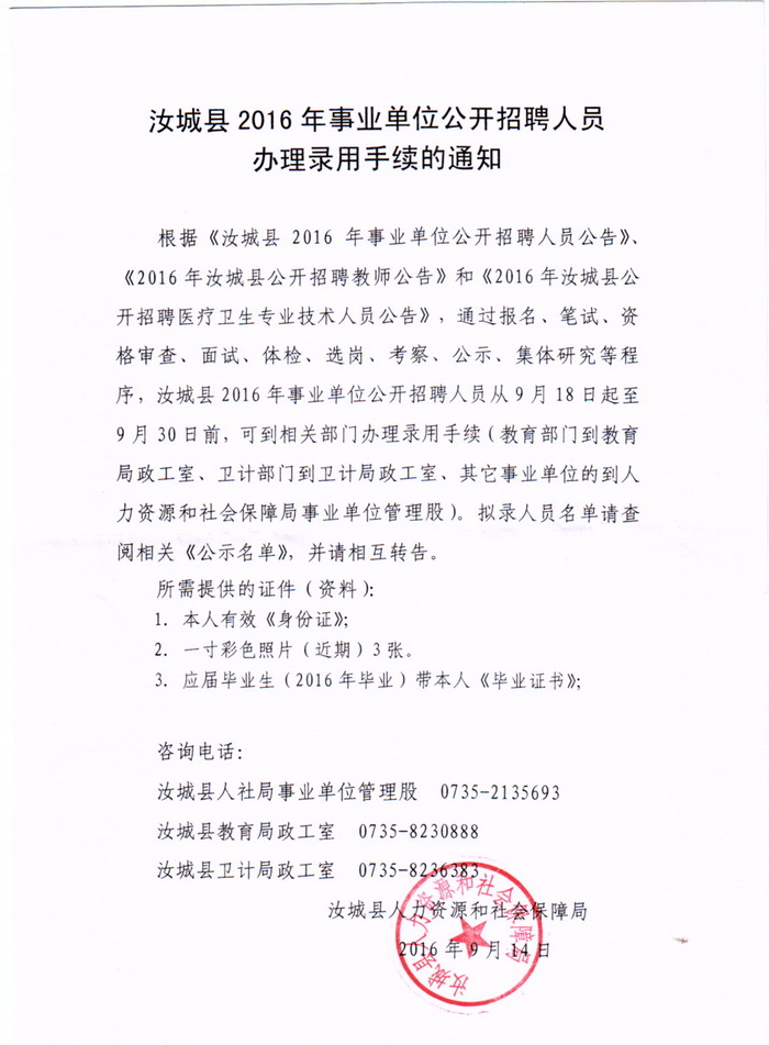 原標題:汝城縣2016年事業單位公開招聘人員辦理錄用手續的通知