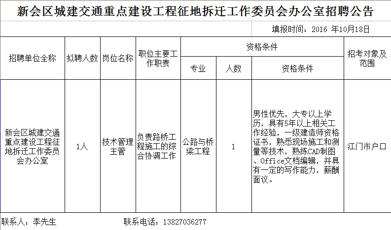 2016廣東江門新會區城建交通重點建設工程征地拆遷工作委員會辦公室招聘公告【招1人】
