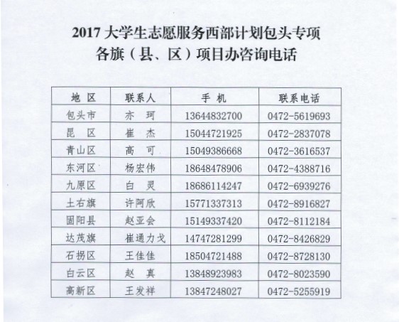 關于西部計劃包頭市地方項目報名,只要符合內蒙古大學生志愿服務西部計劃地方項目招募條件(詳見實施方案預通知),沒有在大學生志愿服務西部計劃官方網站上報名或報名后未通過高校審核的,也可直接致電包頭市各旗縣區項目辦報名參加考試。