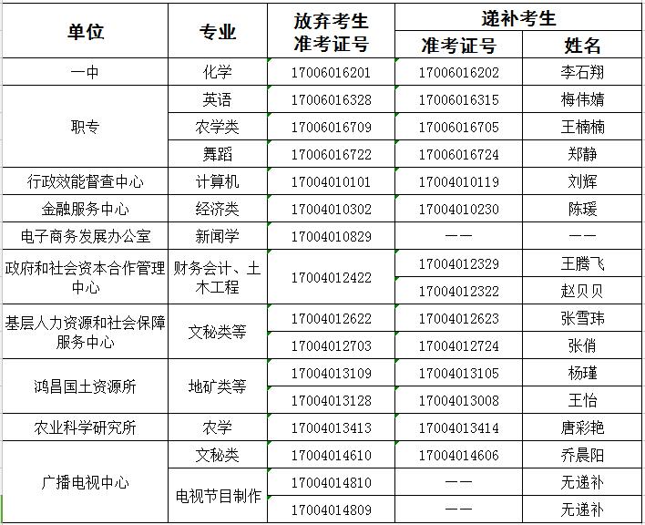博愛縣2017年事業單位公開招聘工作在面試確認階段,有16名考生因個人原因自愿放棄,根據《博愛縣2017年事業單位公開招聘工作人員簡章》規定:擬招聘職位人數與面試人數不足1:3比例的,按照筆試成績從到低分依次遞補。現將放棄考生準考證號和遞補考生名單公告如下: