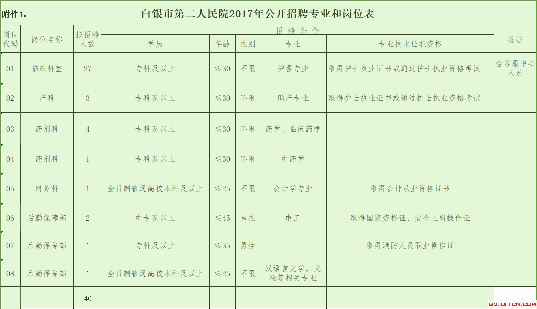 本次招聘工作人員共40名,其中:護理人員30名、藥劑人員5名、財務人員1名、電工2名、消防人員1名,文秘人員1名。