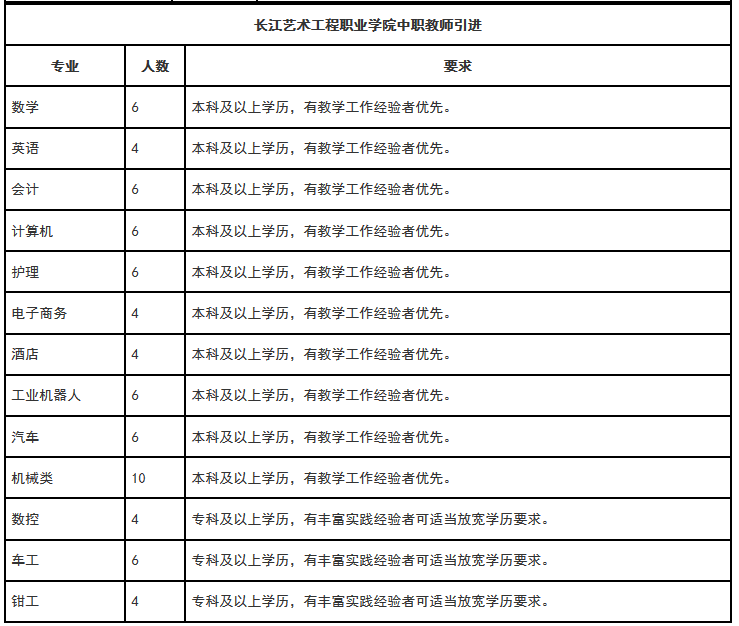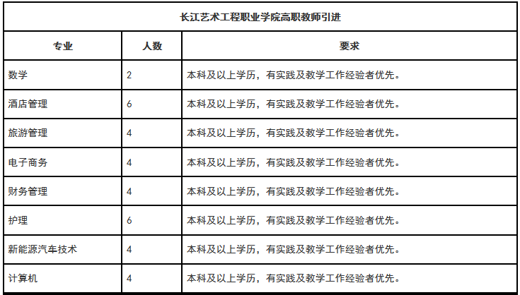2.報名方式:請將個人簡歷、個人證件掃描件(畢業證、學歷證、資格證書等其它個人能力證明材料)以附件形式,按“應聘專業+姓名+畢業+學歷+專業+高校人才網”命名(如:“護理+張三+長江藝術工程職業學院+碩士+護理學+高校人才網”),將簡歷發送至cjysgc@126.com郵箱,請勿重復投遞。