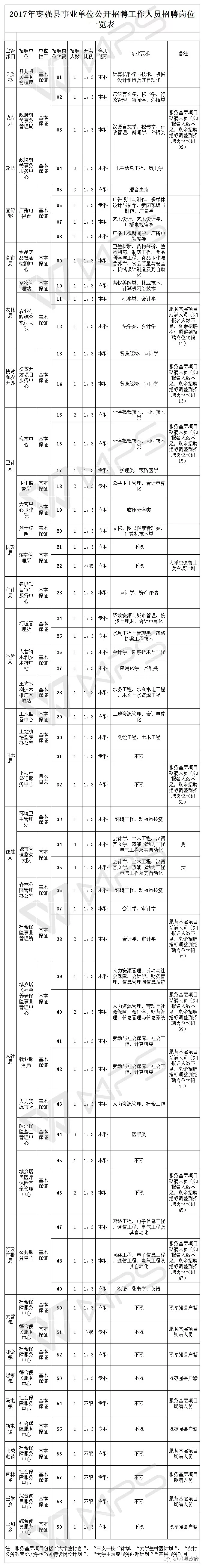 各招聘單位的招聘人數、招聘條件等詳情見《2017年棗強縣事業單位公開招聘工作人員招聘崗位一覽表》。