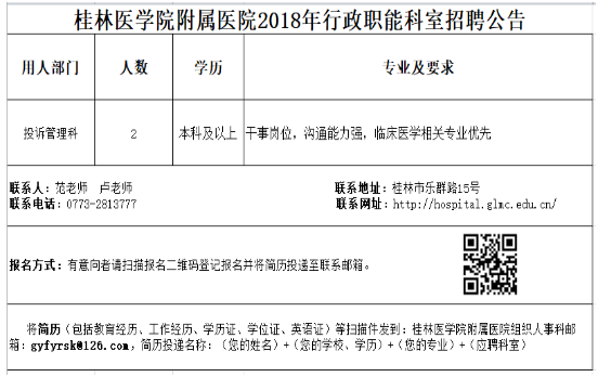 2018廣西桂林醫學院附屬醫院行政職能科室招聘公告