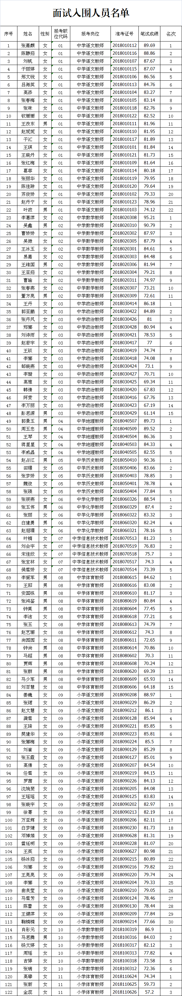 嘉峪關(guān)市2018年教育系統(tǒng)公開(kāi)招聘教師筆試工作已經(jīng)結(jié)束,根據(jù)《嘉峪關(guān)市2018年教育系統(tǒng)公開(kāi)招聘教師公告》規(guī)定,按照筆試成績(jī)從高到低排序,最終確定進(jìn)入面試人員122人。現(xiàn)將面試有關(guān)事項(xiàng)和入圍人員名單公布如下: