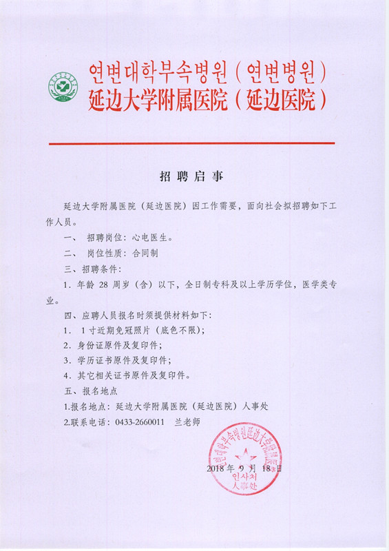 2018延邊大學(xué)附屬醫(yī)院招聘心電醫(yī)生公告