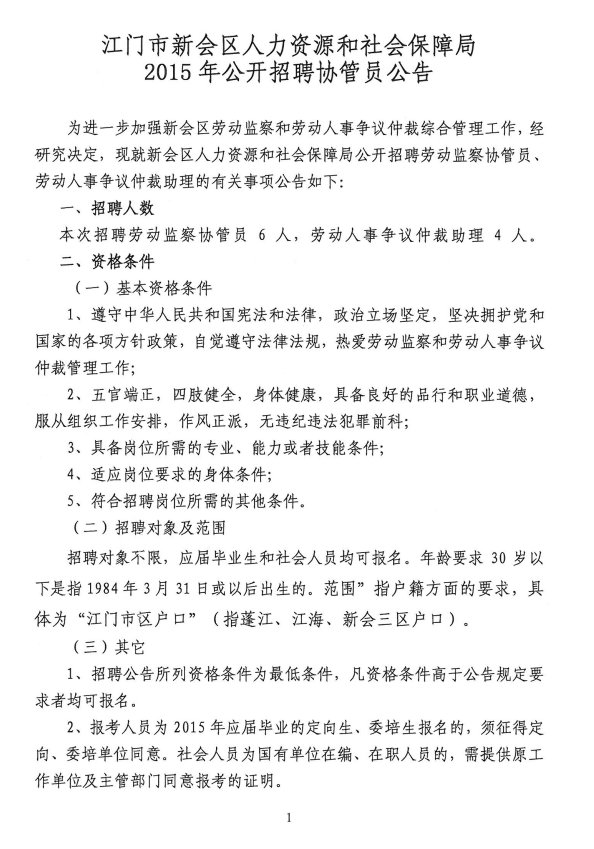 2015年廣東省江門市新會區人力資源和社會局招聘協管員10人公告