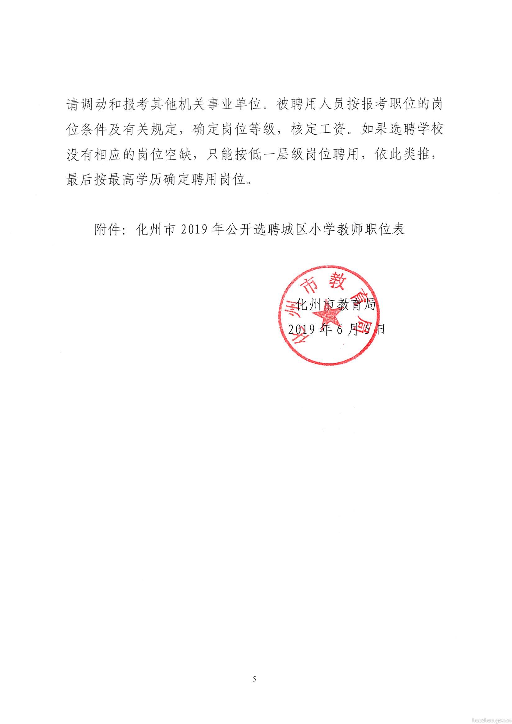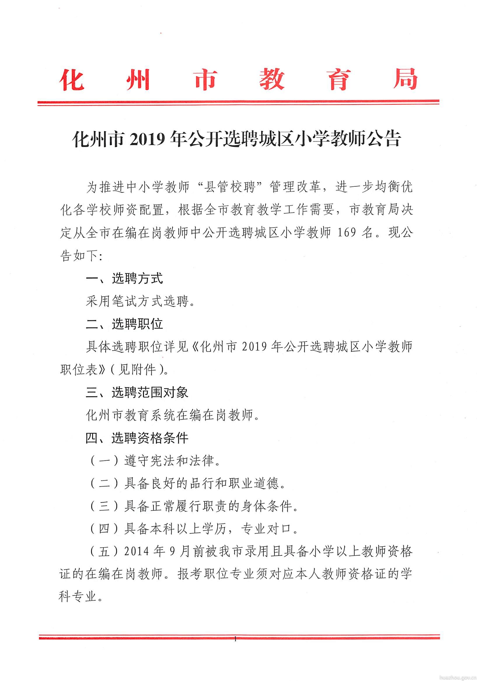 2019廣東茂名化州市選聘城區小學教師169人公告