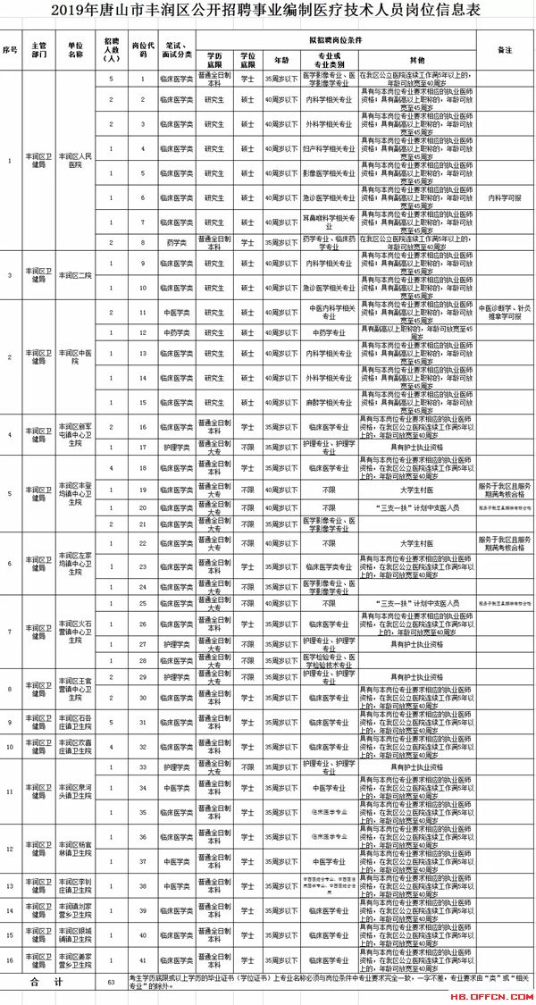 本次公開招聘事業編制醫療技術人員63名,具體崗位、人數及條件要求詳見《唐山市豐潤區2019年公開招聘事業編制醫療技術人員崗位信息表》。招聘采取統一招聘方式。筆試、面試考務工作,由豐潤區公開招聘事業單位工作人員領導小組辦公室委托第三方考試機構組織實施。