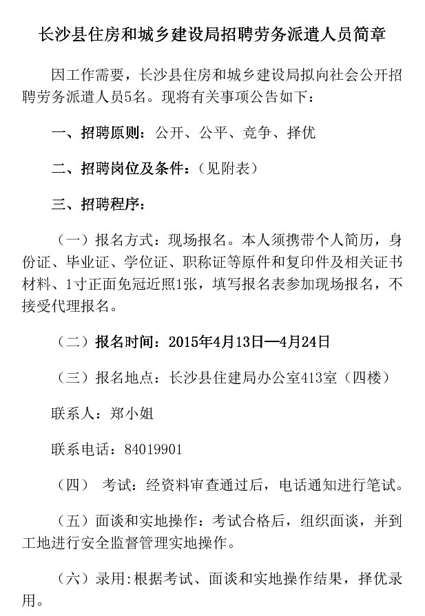 2015年湖南省長沙縣住房和城鄉建設局招聘勞務派遣人員公告【招5名】