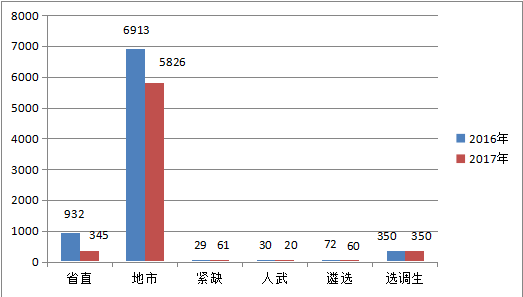 2017年浙江省公務員考試的招錄人數呈現遞減趨勢,但是,今年也有增加,如殘疾人招錄人數增加、公務員遴選與省考同步進行、選調生數量不變,等等。具體如下圖: