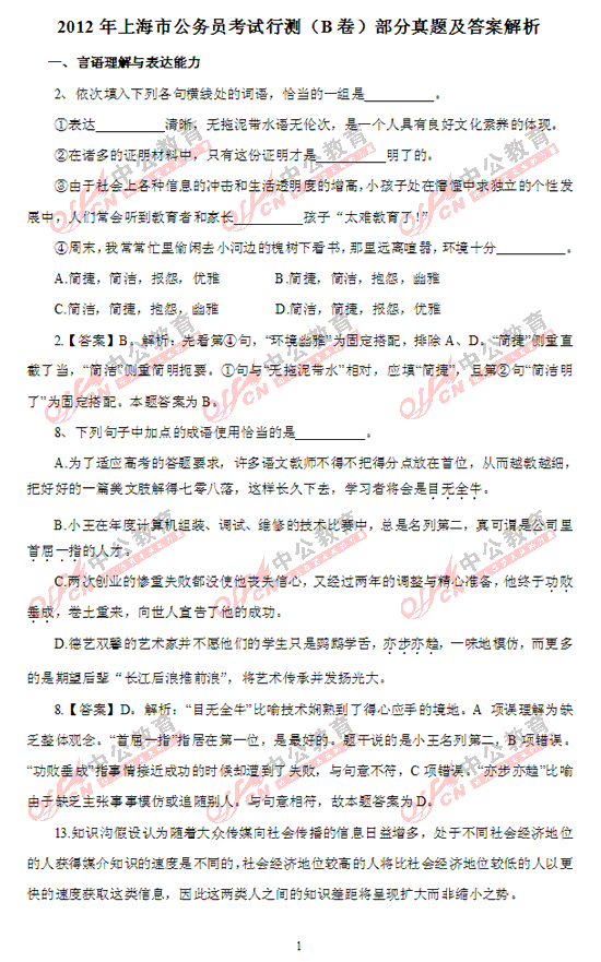 2012年上海市公務員考試行測(B卷)部分及答案解析